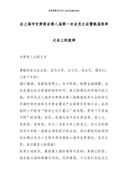 【七哥公文】2025年:在上海市甘肃商会第八届第一次会员大会暨换届选举大会上的致辞_副本+更多免费公文+VX:QiGeGongWen2024
