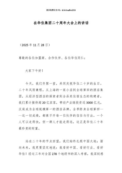 / 【七哥公文】2025年:在华住集团二十周年大会上的讲话_副本+更多免费公文+VX:QiGeGongWen2024