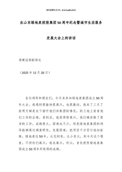 【七哥公文】2025年:在山东绿地泉控股集团50周年纪念暨城市生活服务发展大会上的讲话_副本+更多免费公文+VX:QiGeGongWen2024