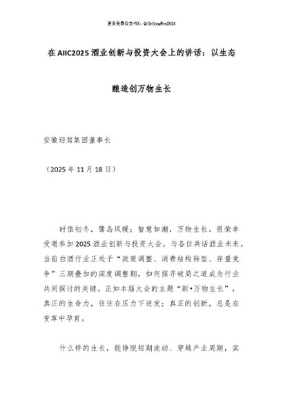【七哥公文】2025年:在AIIC2025酒业创新与投资大会上的讲话:以生态酿造创万物生长_副本+更多免费公文+VX:QiGeGongWen2024