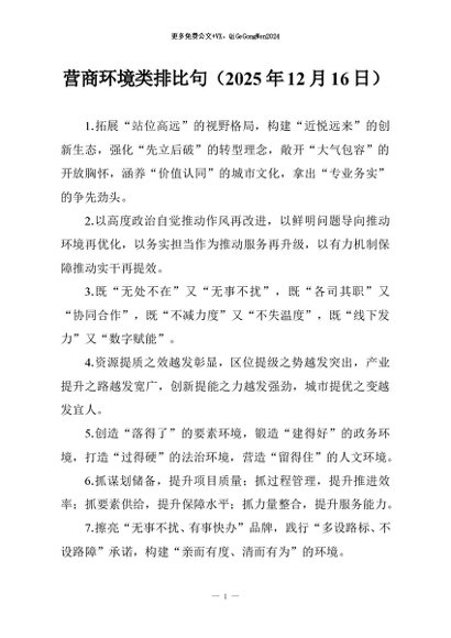 / 【七哥公文】2025年:营商环境类排比句(2025年12月16日)+更多免费公文+VX:QiGeGongWen2024