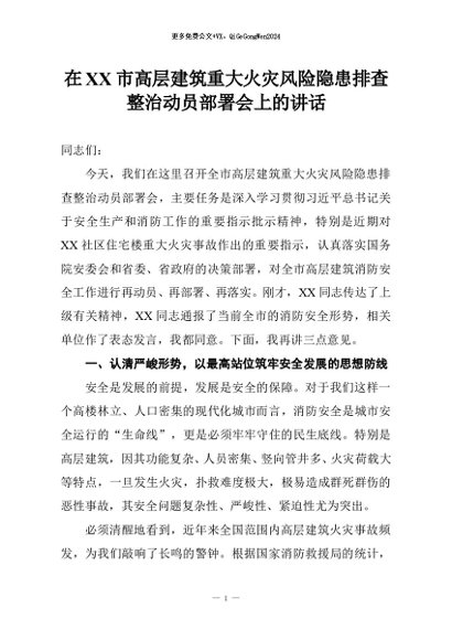 【七哥公文】2025年:在XX市高层建筑重大火灾风险隐患排查整治动员部署会上的讲话+更多免费公文+VX:QiGeGongWen2024