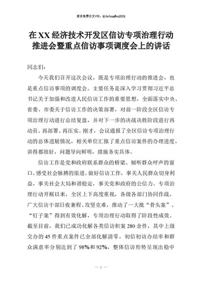 【七哥公文】2025年:在XX经济技术开发区信访专项治理行动推进会暨重点信访事项调度会上的讲话+更多免费公文+VX:QiGeGongWen2024
