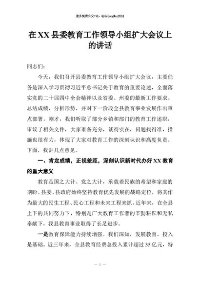 / 【七哥公文】2025年:在XX县委教育工作领导小组扩大会议上的讲话+更多免费公文+VX:QiGeGongWen2024