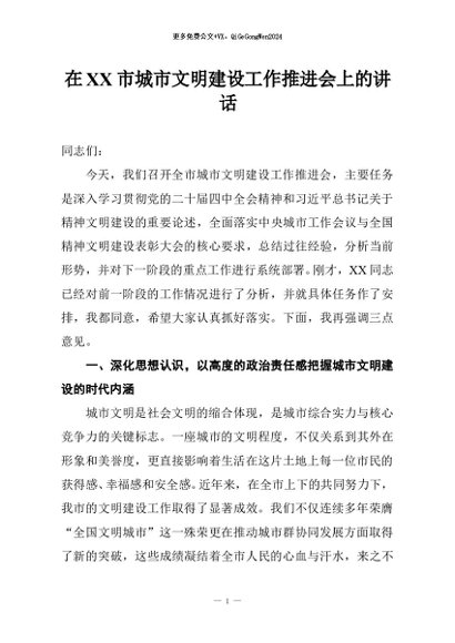 / 【七哥公文】2025年:在XX市城市文明建设工作推进会上的讲话+更多免费公文+VX:QiGeGongWen2024