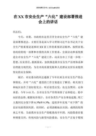/ 【七哥公文】2025年:在XX市安全生产“六化”建设部署推进会上的讲话+更多免费公文+VX:QiGeGongWen2024