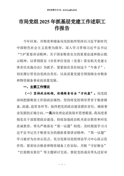 / 【七哥公文】2025年:市局党组2025年抓基层党建工作述职工作报告+更多免费公文+VX:QiGeGongWen2024