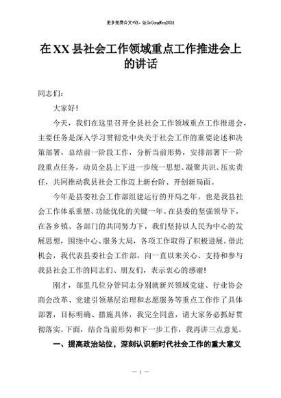 / 【七哥公文】2025年:在XX县社会工作领域重点工作推进会上的讲话+更多免费公文+VX:QiGeGongWen2024