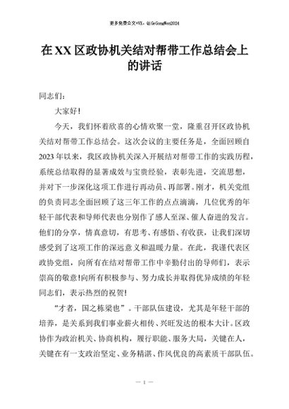 / 【七哥公文】2025年:在XX区政协机关结对帮带工作总结会上的讲话+更多免费公文+VX:QiGeGongWen2024