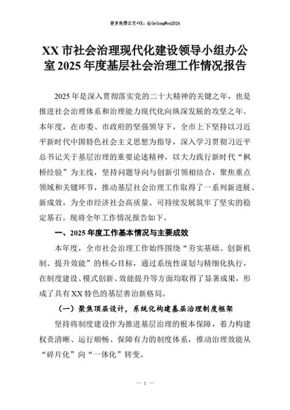 【七哥公文】2025年:XX市社会治理现代化建设领导小组办公室2025年度基层社会治理工作情况报告+更多免费公文+VX:QiGeGongWen2024