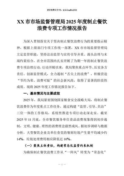 【七哥公文】2025年:XX市市场监督管理局2025年度制止餐饮浪费专项工作情况报告+更多免费公文+VX:QiGeGongWen2024
