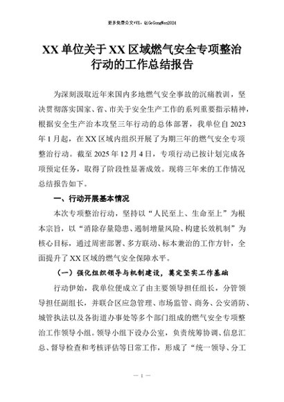 【七哥公文】2025年:XX单位关于XX区域燃气安全专项整治行动的工作总结报告+更多免费公文+VX:QiGeGongWen2024