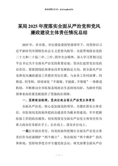 【七哥公文】2025年:某局2025年度落实全面从严治党和党风廉政建设主体责任情况总结+更多免费公文+VX:QiGeGongWen2024