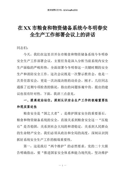 【七哥公文】2025年:在XX市粮食和物资储备系统今冬明春安全生产工作部署会议上的讲话+更多免费公文+VX:QiGeGongWen2024