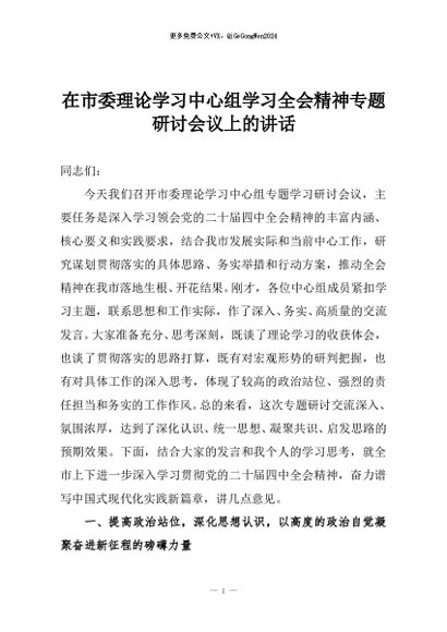 【七哥公文】2025年:在市委理论学习中心组学习全会精神专题研讨会议上的讲话+更多免费公文+VX:QiGeGongWen2024
