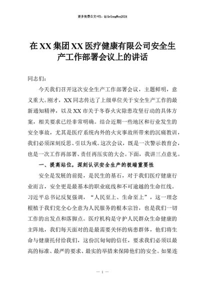 【七哥公文】2025年:在XX集团XX医疗健康有限公司安全生产工作部署会议上的讲话+更多免费公文+VX:QiGeGongWen2024