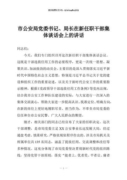 【七哥公文】2025年:市公安局党委书记、局长在新任职干部集体谈话会上的讲话+更多免费公文+VX:QiGeGongWen2024