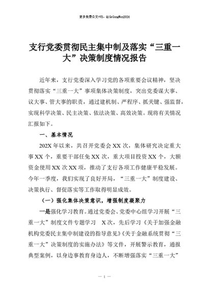 【七哥公文】2025年:支行党委贯彻民主集中制及落实“三重一大”决策制度情况报告+更多免费公文+VX:QiGeGongWen2024