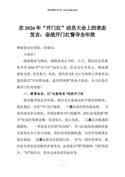 【七哥公文】2025年:在2026年“开门红”动员大会上的表态发言:奋战开门红誓夺全年胜+更多免费公文+VX:QiGeGongWen2024