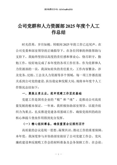 / 【七哥公文】2025年:公司党群和人力资源部2025年度个人工作总结+更多免费公文+VX:QiGeGongWen2024