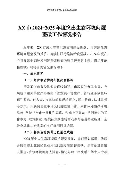 【七哥公文】2025年:XX市2024-2025年度突出生态环境问题整改工作情况报告+更多免费公文+VX:QiGeGongWen2024