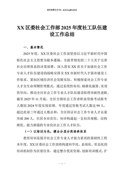 【七哥公文】2025年:XX区委社会工作部2025年度社工队伍建设工作总结+更多免费公文+VX:QiGeGongWen2024