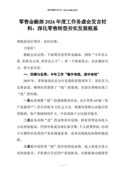 【七哥公文】2025年:零售金融部2026年度工作务虚会发言材料:深化零售转型夯实发展根基+更多免费公文+VX:QiGeGongWen2024