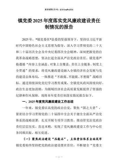/ 【七哥公文】2025年:镇党委2025年度落实党风廉政建设责任制情况的报告+更多免费公文+VX:QiGeGongWen2024