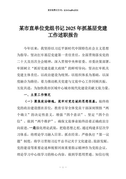 【七哥公文】2025年:某市直单位党组书记2025年抓基层党建工作述职报告+更多免费公文+VX:QiGeGongWen2024