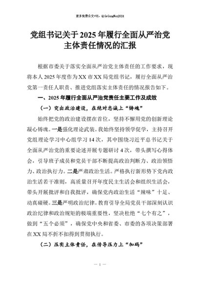 【七哥公文】2025年:党组书记关于2025年履行全面从严治党主体责任情况的汇报+更多免费公文+VX:QiGeGongWen2024
