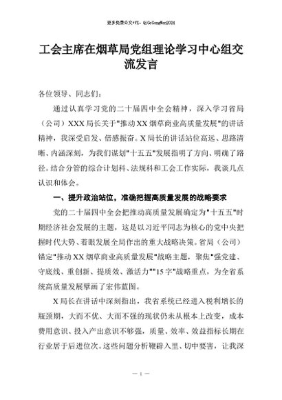 / 【七哥公文】2025年:工会主席在烟草局党组理论学习中心组交流发言+更多免费公文+VX:QiGeGongWen2024
