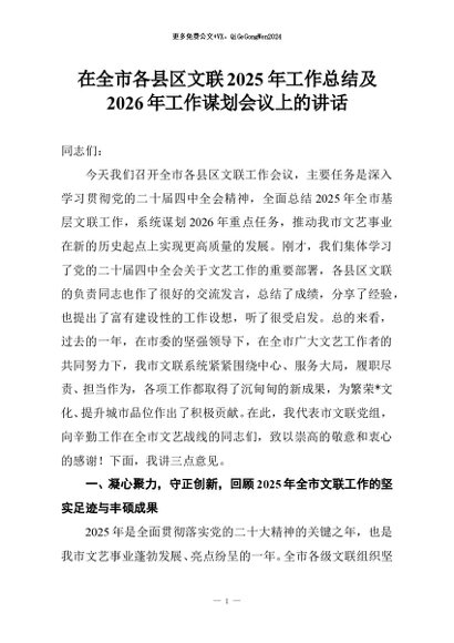 【七哥公文】2025年:在全市各县区文联2025年工作总结及2026年工作谋划会议上的讲话+更多免费公文+VX:QiGeGongWen2024