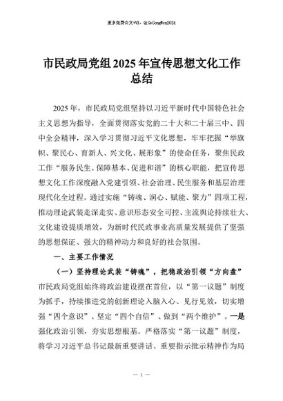 / 【七哥公文】2025年:市民政局党组2025年宣传思想文化工作总结+更多免费公文+VX:QiGeGongWen2024