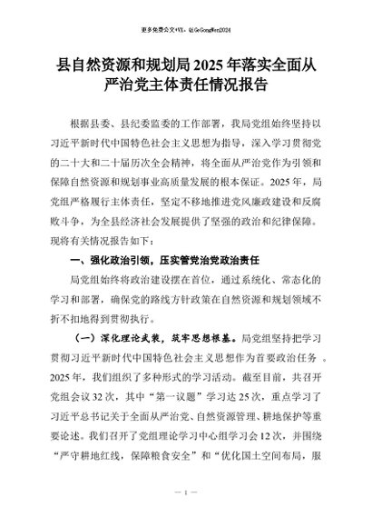 【七哥公文】2025年:县自然资源和规划局2025年落实全面从严治党主体责任情况报告+更多免费公文+VX:QiGeGongWen2024