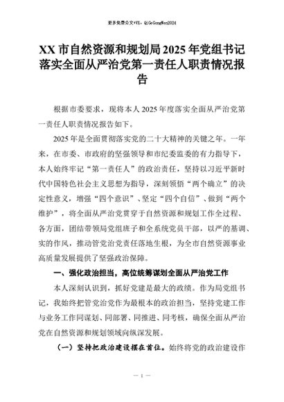 【七哥公文】2025年:XX市自然资源和规划局2025年党组书记落实全面从严治党第一责任人职责情况报告+更多免费公文+VX:QiGeGongWen2024