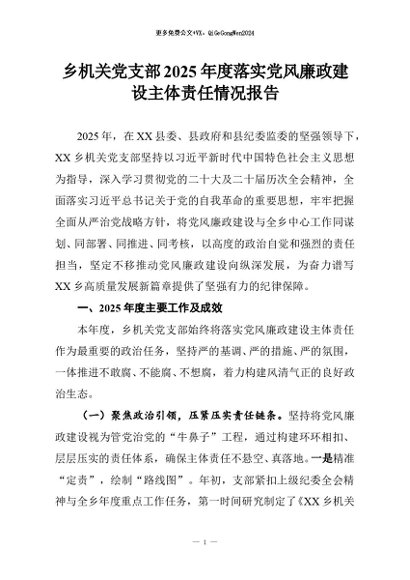 【七哥公文】2025年:乡机关党支部2025年度落实党风廉政建设主体责任情况报告+更多免费公文+VX:QiGeGongWen2024
