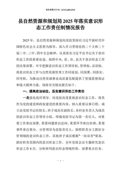 【七哥公文】2025年:县自然资源和规划局2025年落实意识形态工作责任制情况报告+更多免费公文+VX:QiGeGongWen2024
