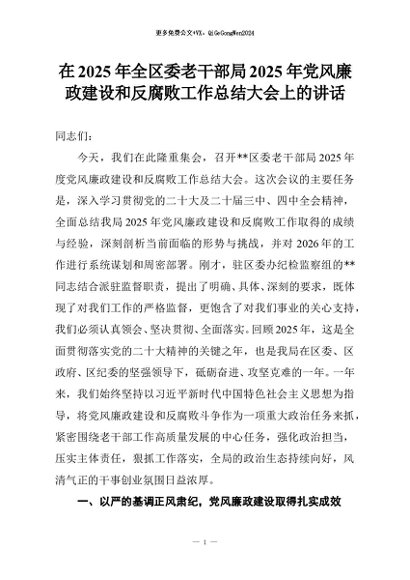 【七哥公文】2025年:在2025年全区委老干部局2025年党风廉政建设和反腐败工作总结大会上的讲话+更多免费公文+VX:QiGeGongWen2024