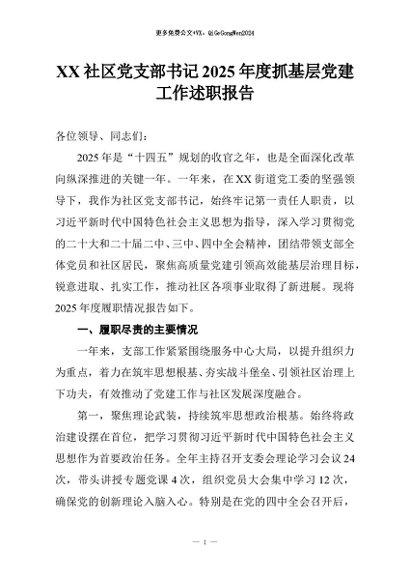 【七哥公文】2025年:XX社区党支部书记2025年度抓基层党建工作述职报告+更多免费公文+VX:QiGeGongWen2024