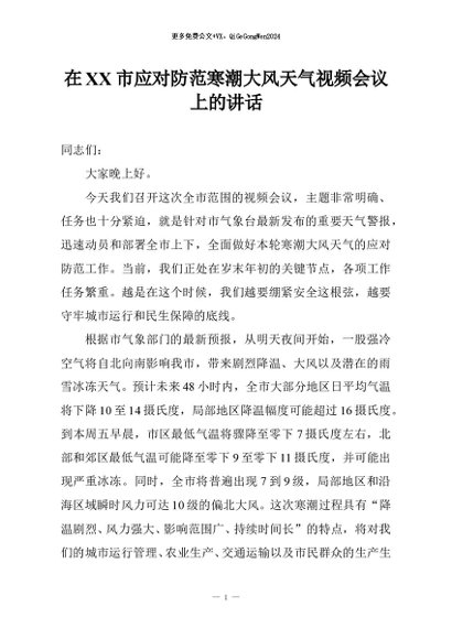 / 【七哥公文】2025年:在XX市应对防范寒潮大风天气视频会议上的讲话+更多免费公文+VX:QiGeGongWen2024