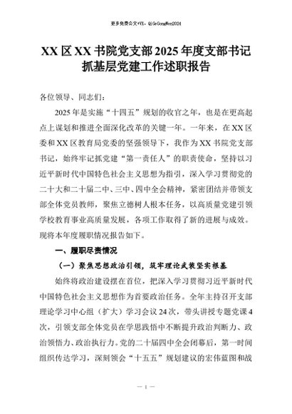 【七哥公文】2025年:XX区XX书院党支部2025年度支部书记抓基层党建工作述职报告+更多免费公文+VX:QiGeGongWen2024
