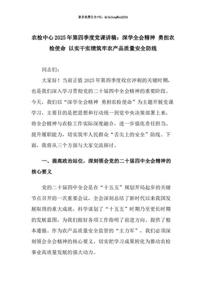 【七哥公文】2025年:农检中心2025年第四季度党课讲稿:深学全会精神 勇担农检使命 以实干实绩筑牢农产品质量安全防线+更多免费公文+VX:QiGeGongWen2024