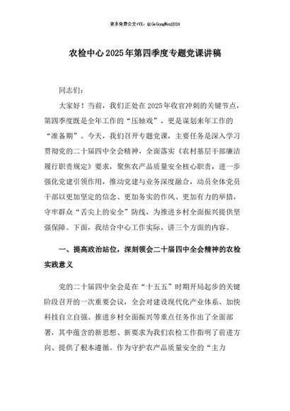 / 【七哥公文】2025年:农检中心2025年第四季度专题党课讲稿+更多免费公文+VX:QiGeGongWen2024