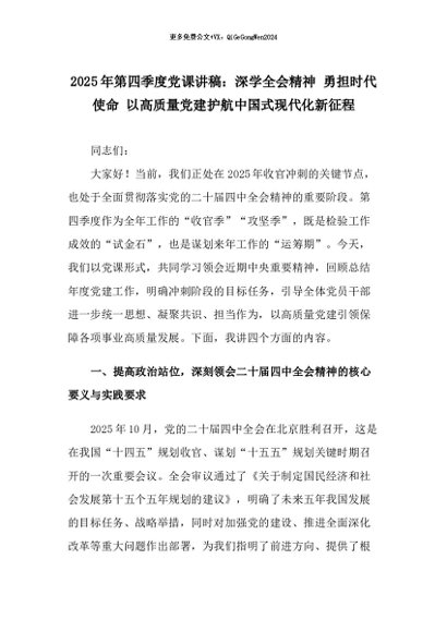 【七哥公文】2025年:2025年第四季度党课讲稿:深学全会精神 勇担时代使命 以高质量党建护航中国式现代化新征程+更多免费公文+VX:QiGeGongWen2024