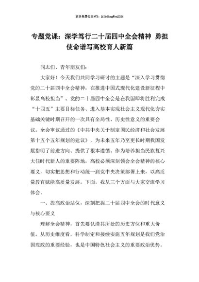 【七哥公文】2025年:专题党课:深学笃行二十届四中全会精神 勇担使命谱写高校育人新篇+更多免费公文+VX:QiGeGongWen2024