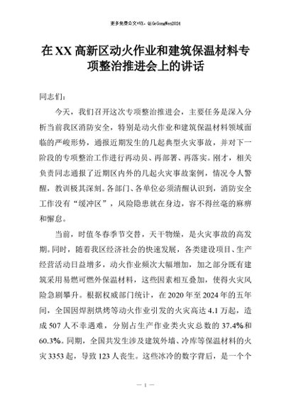 【七哥公文】2025年:在XX高新区动火作业和建筑保温材料专项整治推进会上的讲话+更多免费公文+VX:QiGeGongWen2024