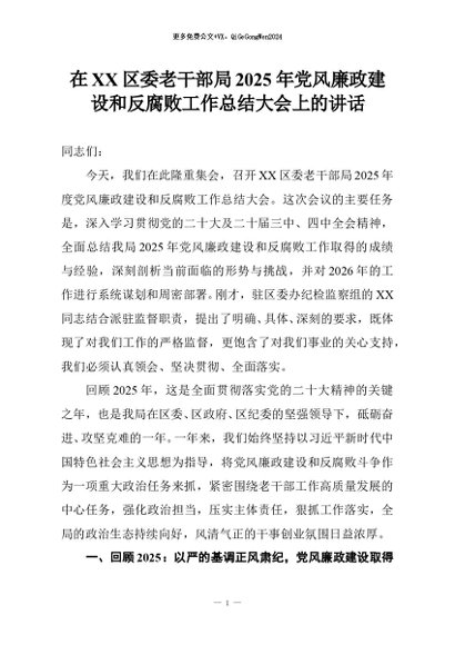 【七哥公文】2025年:在XX区委老干部局2025年党风廉政建设和反腐败工作总结大会上的讲话+更多免费公文+VX:QiGeGongWen2024