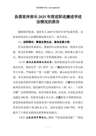 【七哥公文】2025年:县委宣传部长2025年度述职述廉述学述法情况的报告+更多免费公文+VX:QiGeGongWen2024