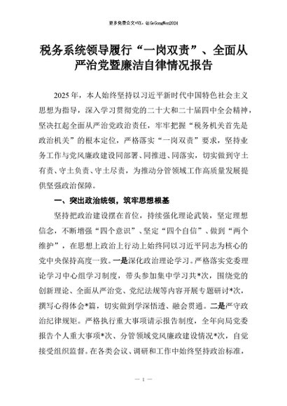 【七哥公文】2025年:税务系统领导履行“一岗双责”、全面从严治党暨廉洁自律情况报告+更多免费公文+VX:QiGeGongWen2024