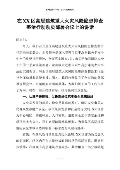 【七哥公文】2025年:在XX区高层建筑重大火灾风险隐患排查整治行动动员部署会议上的讲话+更多免费公文+VX:QiGeGongWen2024